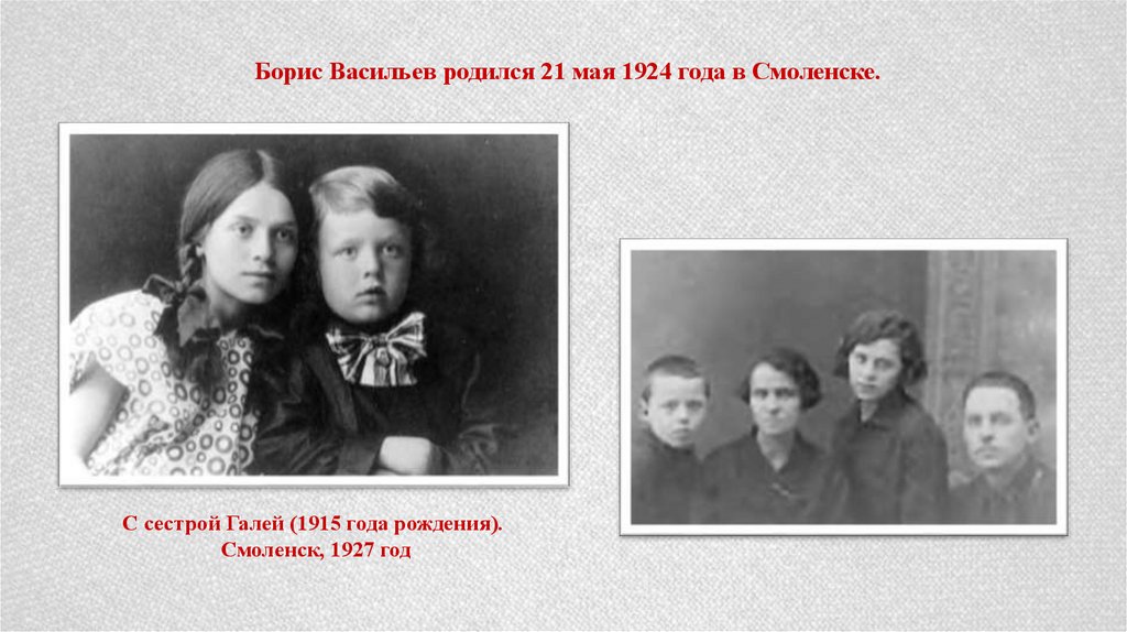 Борис Васильев родился 21 мая 1924 года в Смоленске.С сестрой Галей (1915 года рождения).
