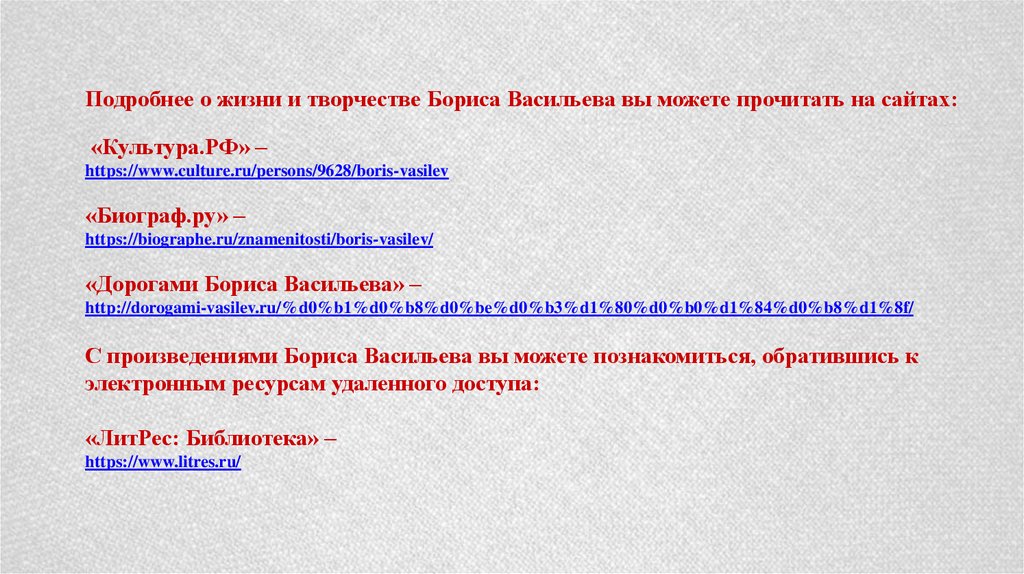Подробнее о жизни и творчестве Бориса Васильева вы можете прочитать на сайтах:«Культура.РФ» –