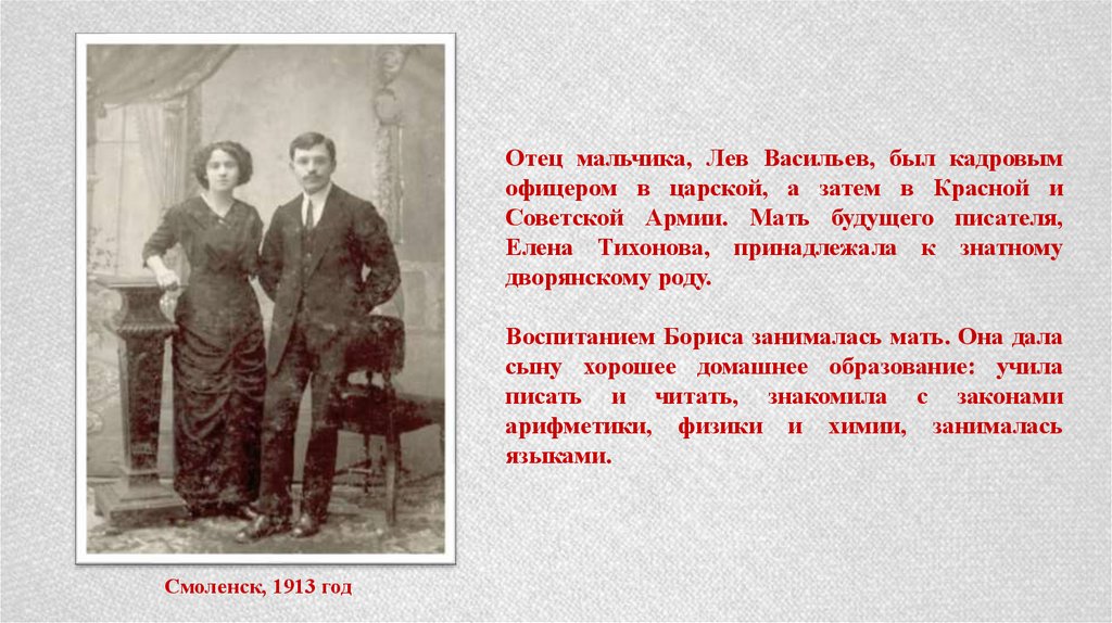 Отец мальчика, Лев Васильев, был кадровымофицером в царской, а затем в Красной и
