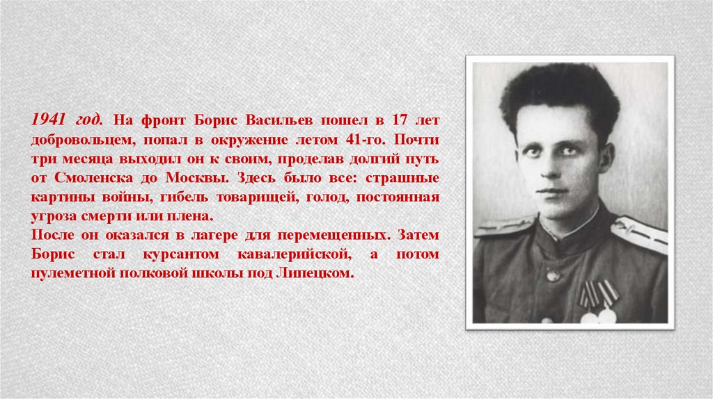 1941 год. На фронт Борис Васильев пошел в 17 летдобровольцем, попал в окружение летом 41-го. Почти