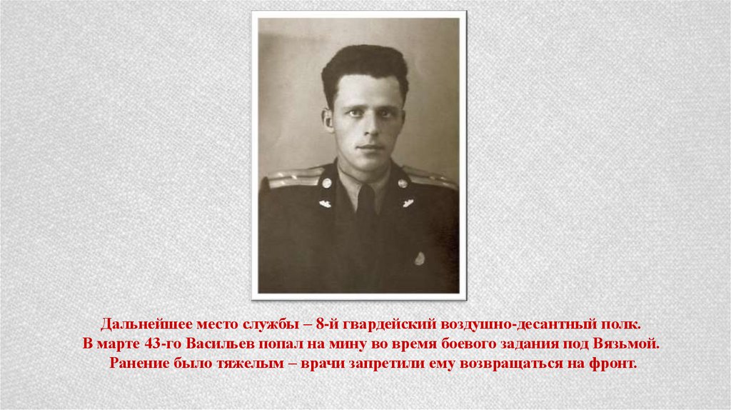 Дальнейшее место службы – 8-й гвардейский воздушно-десантный полк.В марте 43-го Васильев попал на мину во время боевого задания под Вязьмой.