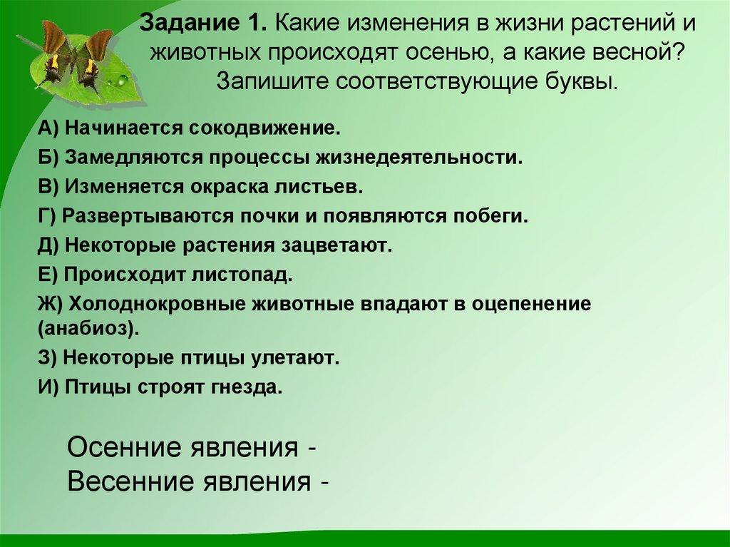 https://yandex.ru/video/preview/176938931220148125556. Задание 1. Какие изменения в жизни растений и животных происходят осенью, а какие весной? Запишите соответствующие буквы.