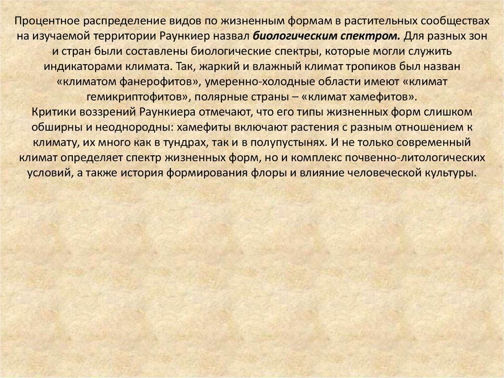 Процентное распределение видов по жизненным формам в растительных сообществахна изучаемой территории Раункиер назвал биологическим спектром. Для разных зон