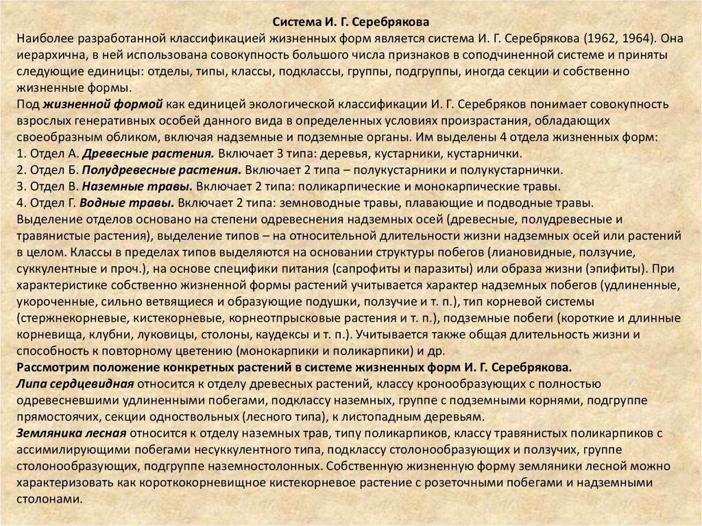 Система И. Г. СеребряковаНаиболее разработанной классификацией жизненных форм является система И. Г. Серебрякова (1962, 1964). Она