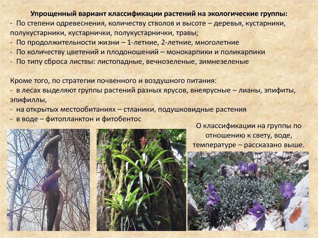 Упрощенный вариант классификации растений на экологические группы:- По степени одревеснения, количеству стволов и высоте – деревья, кустарники,