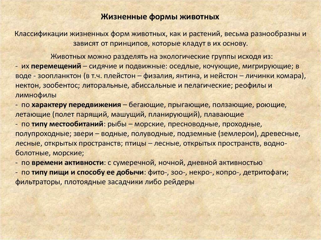 Жизненные формы животныхКлассификации жизненных форм животных, как и растений, весьма разнообразны и
