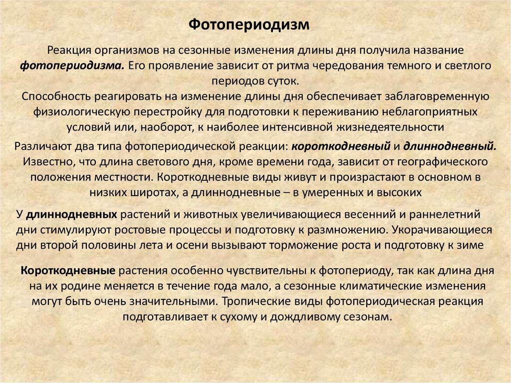 ФотопериодизмРеакция организмов на сезонные изменения длины дня получила название