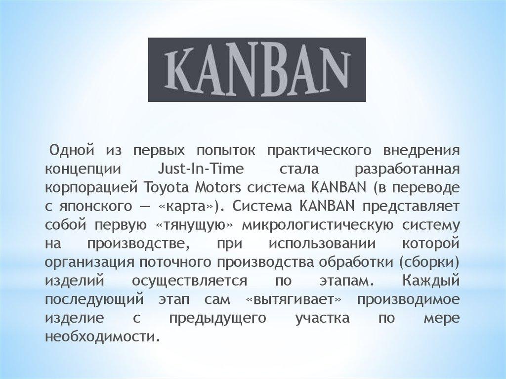 Микрологистическая система KANBAN впервые внедренакорпорацией Toyota Motors в 1972 г. на заводе «Такахама»