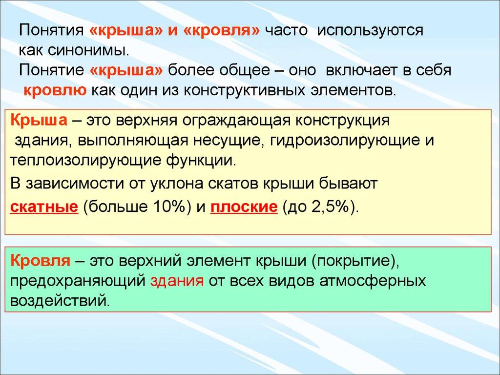 Понятия «крыша» и «кровля» часто используютсякак синонимы.