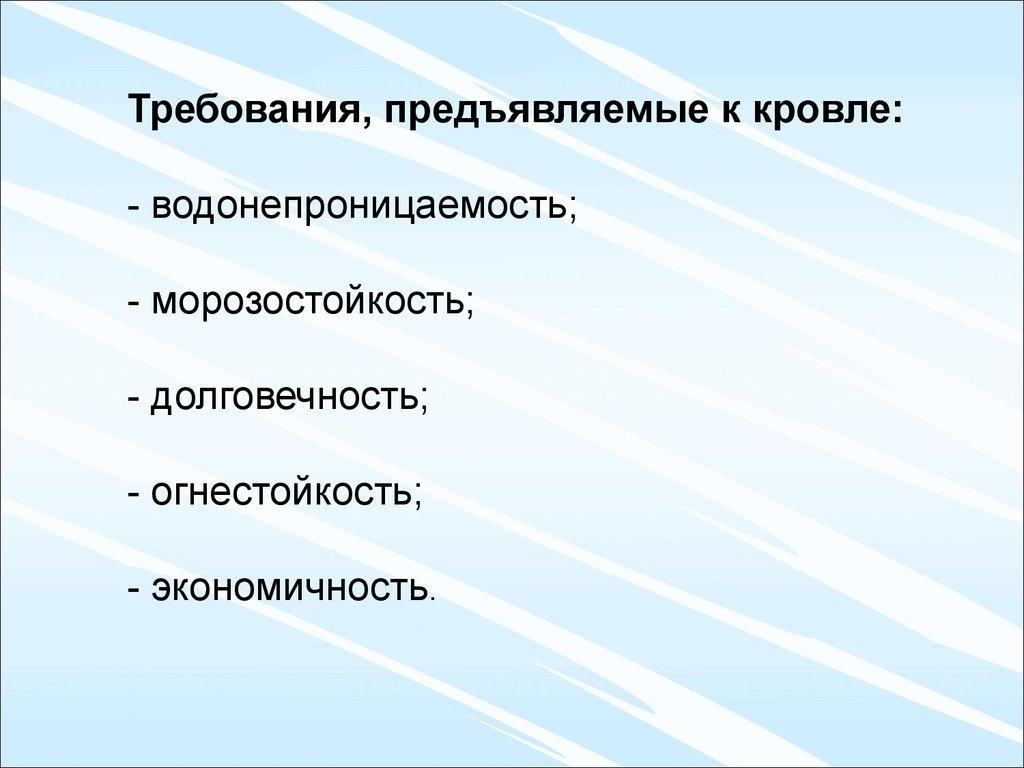 Требования, предъявляемые к кровле:- водонепроницаемость;