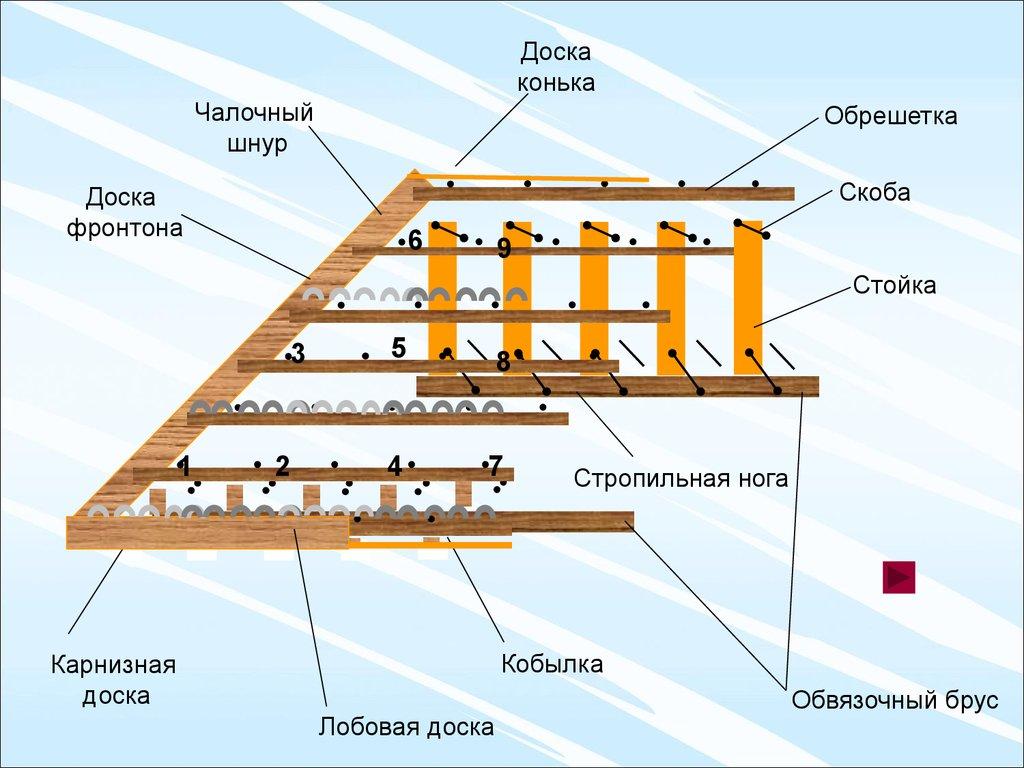 2. Обрешетка.3 Карнизная планка (карнизный короб).4. Кровельные листы.