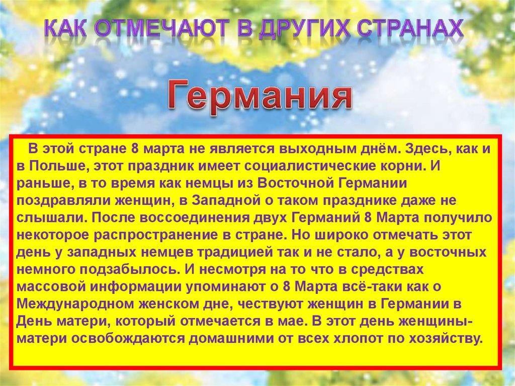 В этой стране 8 марта не является выходным днём. Здесь, как ив Польше, этот праздник имеет социалистические корни. И