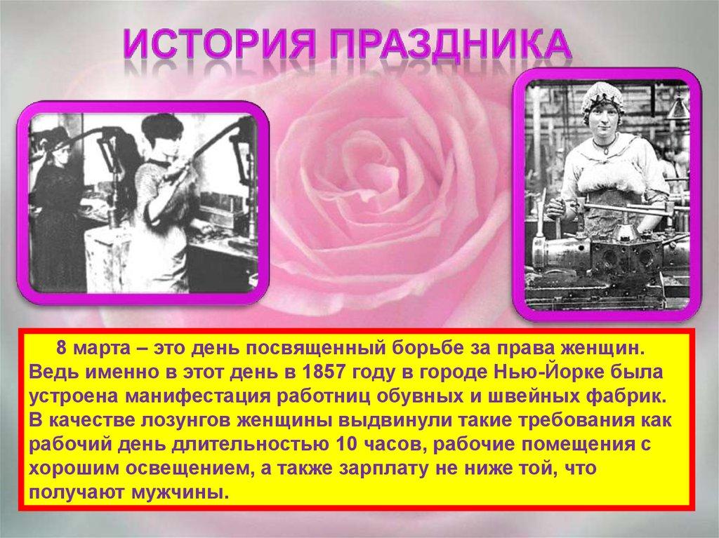 8 марта – это день посвященный борьбе за права женщин.Ведь именно в этот день в 1857 году в городе Нью-Йорке была