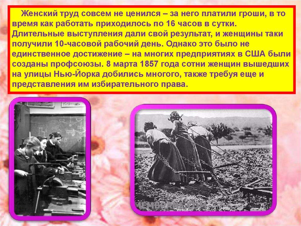 созданы профсоюзы. 8 марта 1857 года сотни женщин вышедших