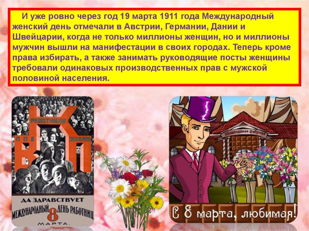 И уже ровно через год 19 марта 1911 года Международныйженский день отмечали в Австрии, Германии, Дании и