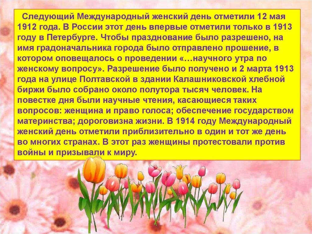 Следующий Международный женский день отметили 12 мая1912 года. В России этот день впервые отметили только в 1913