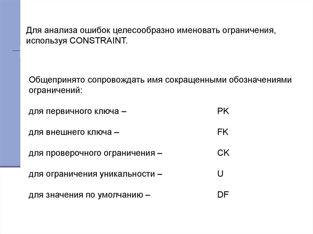 Для анализа ошибок целесообразно именовать ограничения,используя CONSTRAINT.