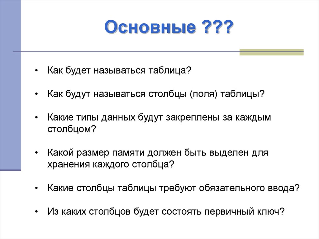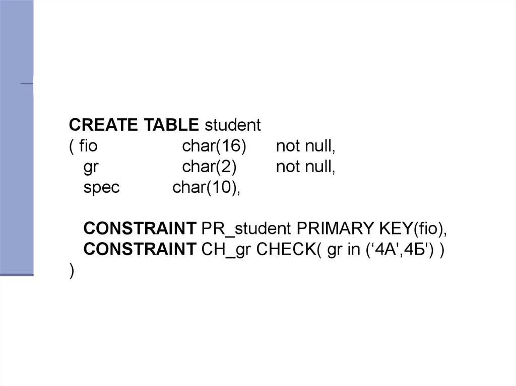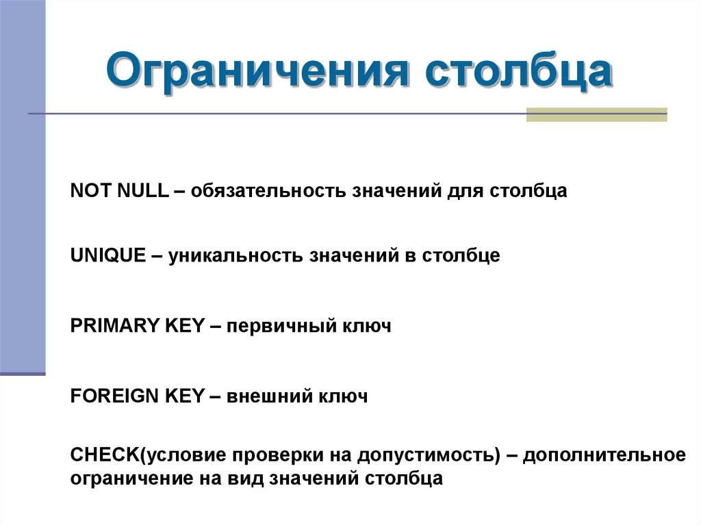 Ограничения столбцаNOT NULL – обязательность значений для столбца
