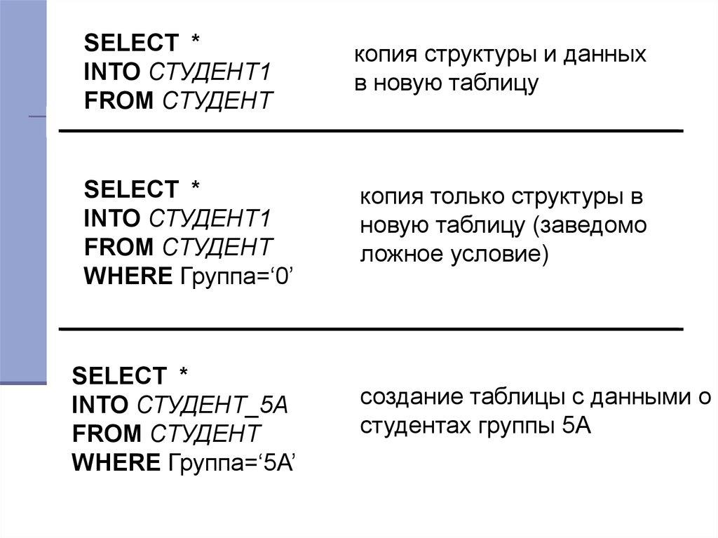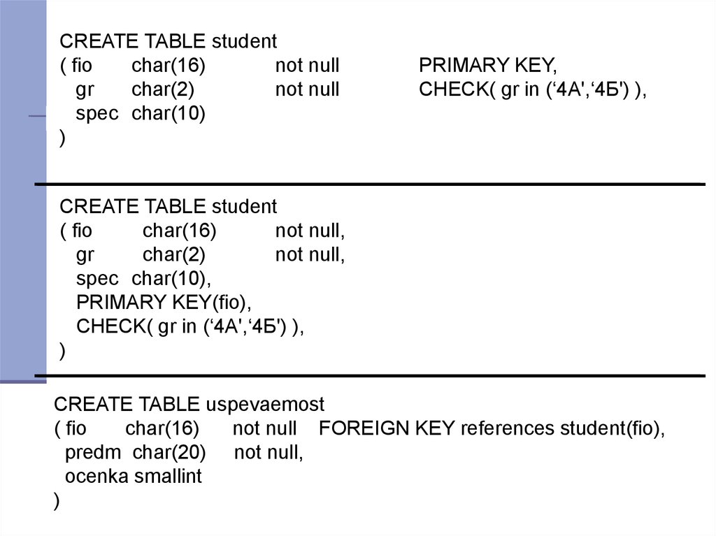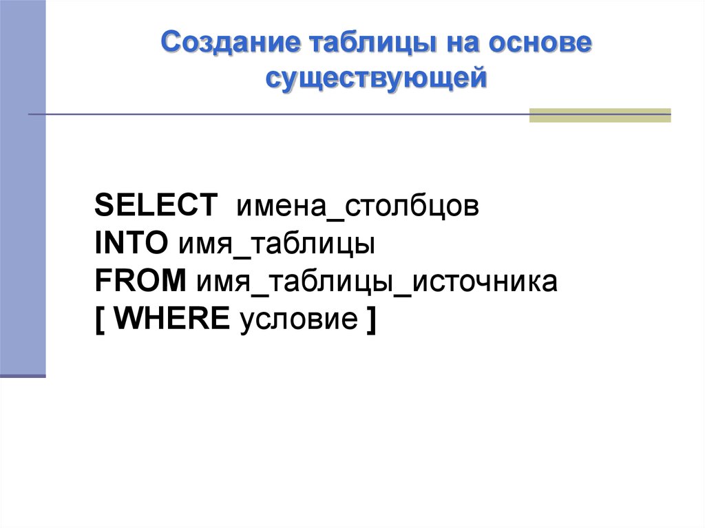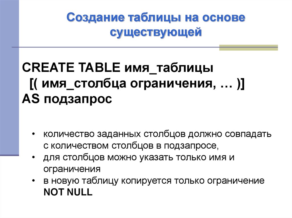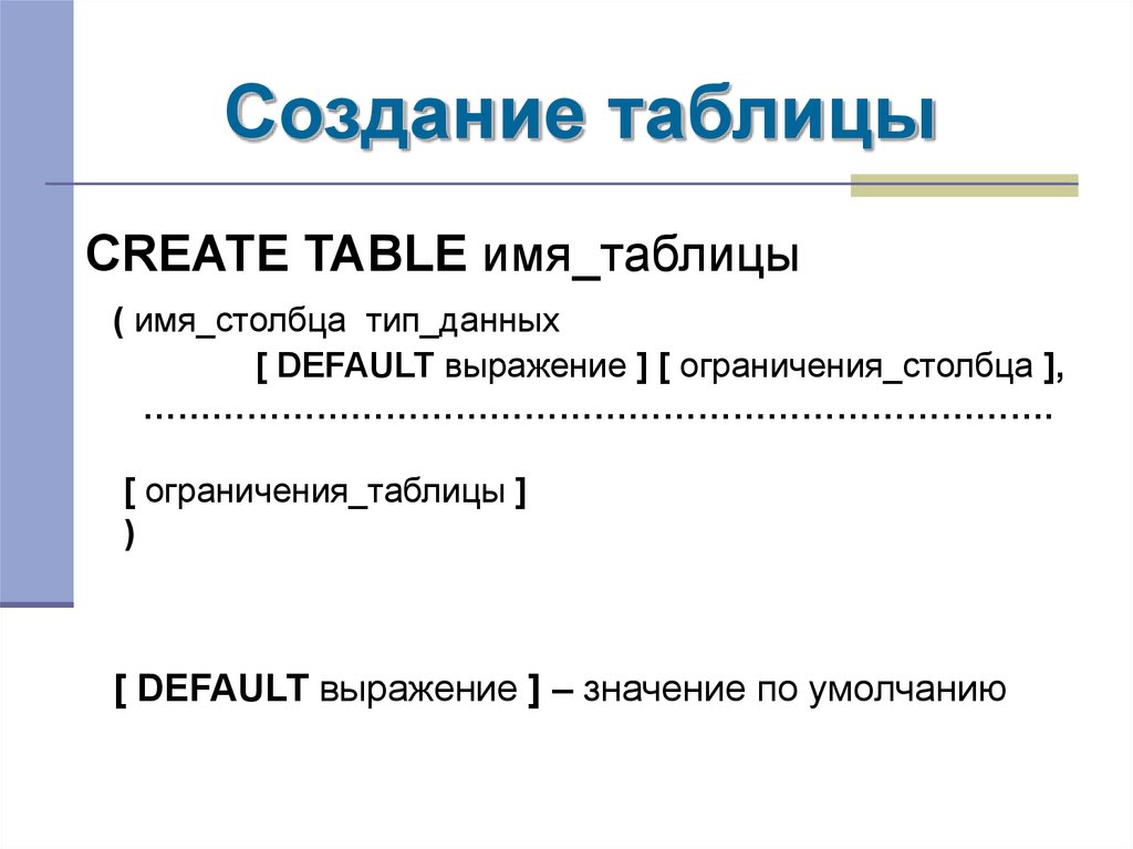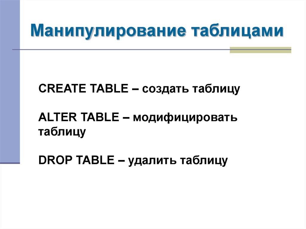 Манипулирование таблицамиCREATE TABLE – создать таблицу