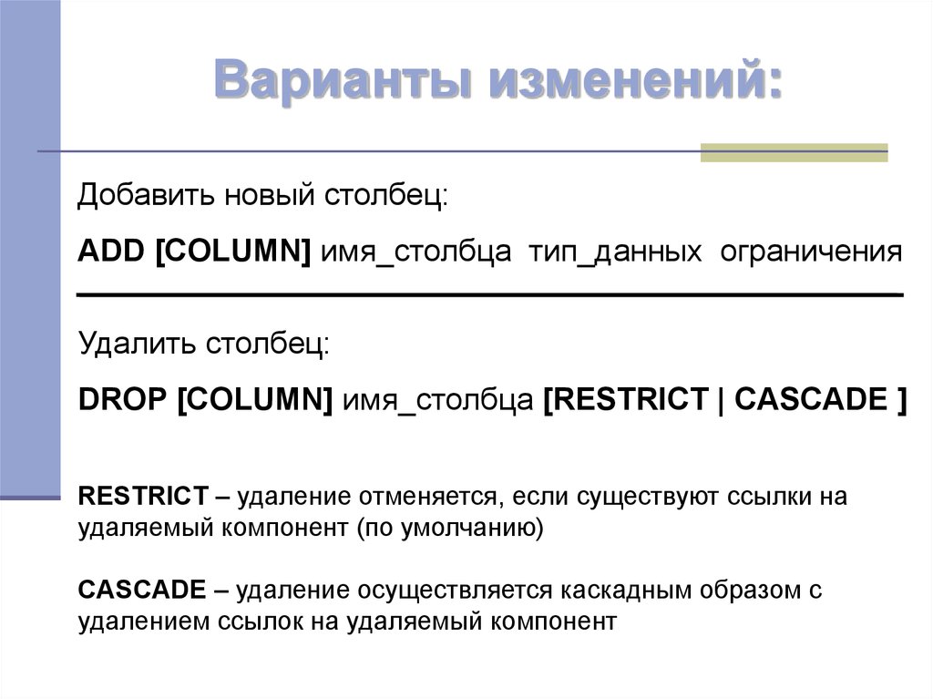 DROP [COLUMN] имя_столбца [RESTRICT | CASCADE ]