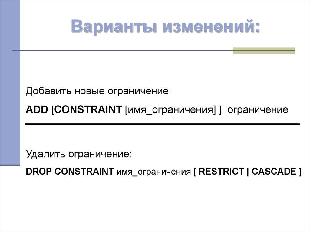 DROP CONSTRAINT имя_ограничения [ RESTRICT | CASCADE ]
