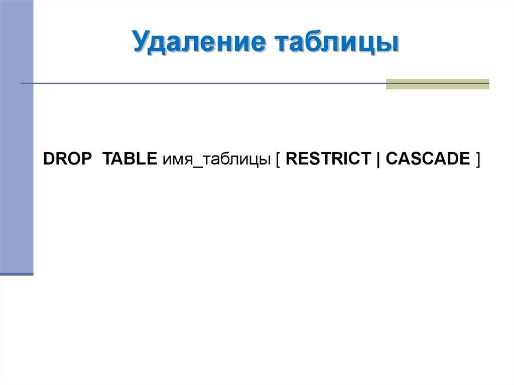 Удаление таблицыDROP TABLE имя_таблицы [ RESTRICT | CASCADE ]