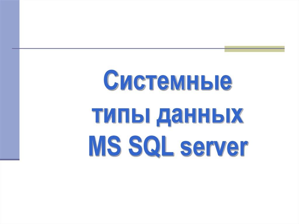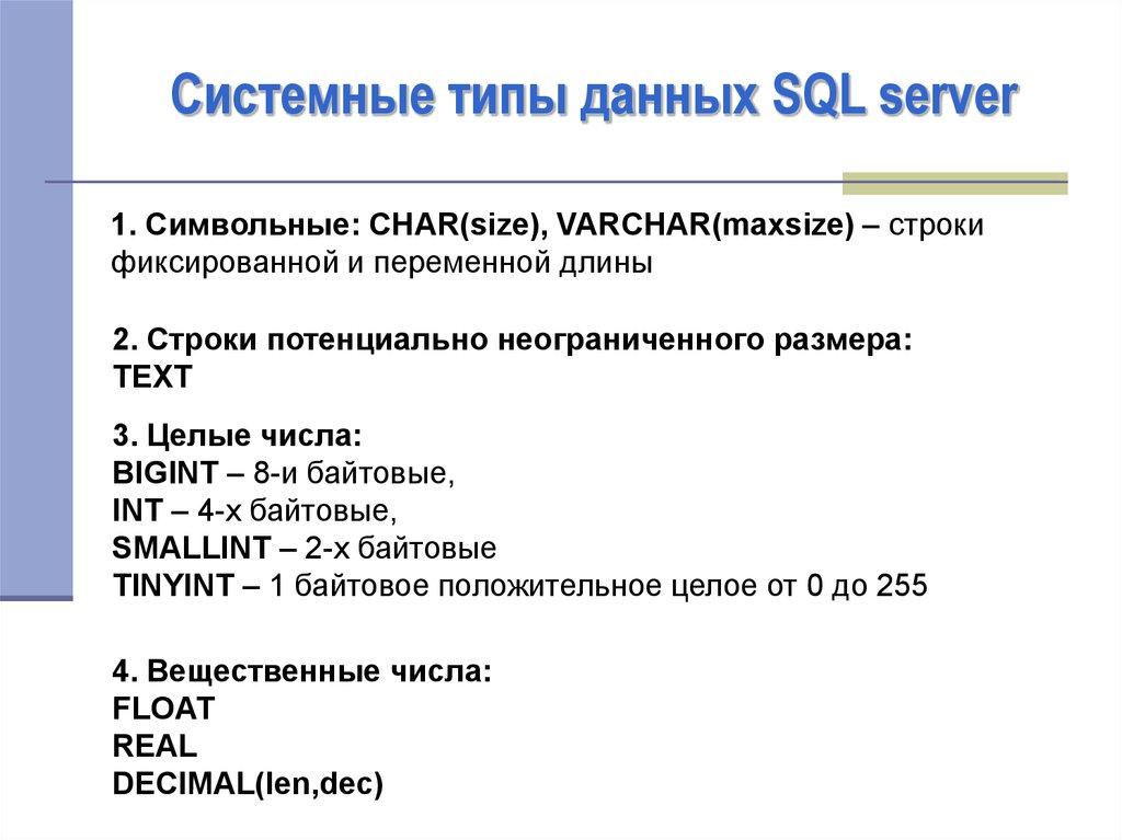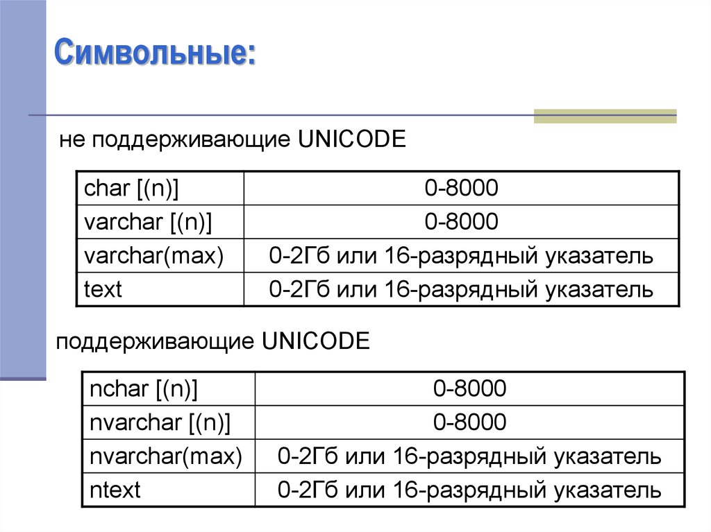 Системные типы данных SQL server1. Символьные: CHAR(size), VARCHAR(maxsize) – строки