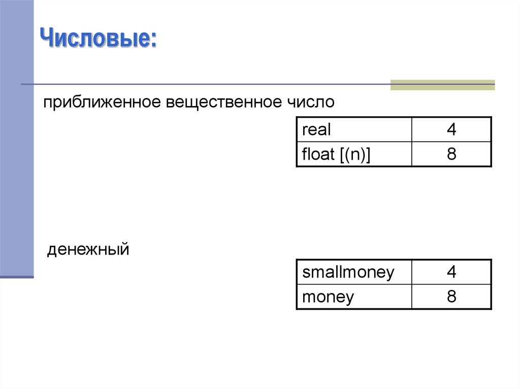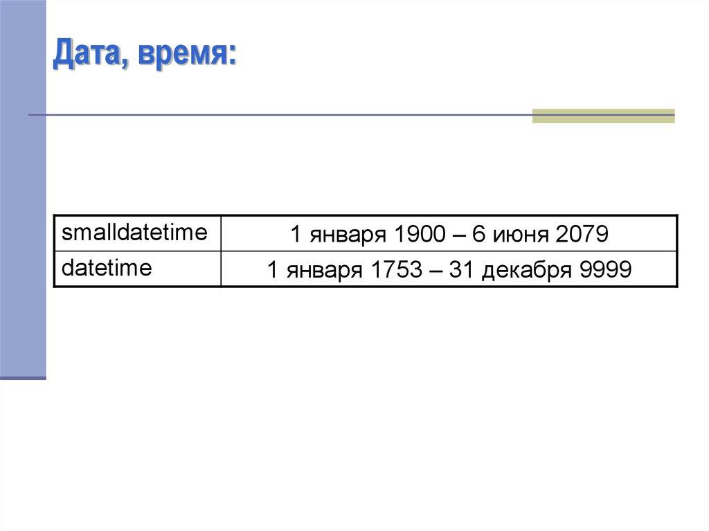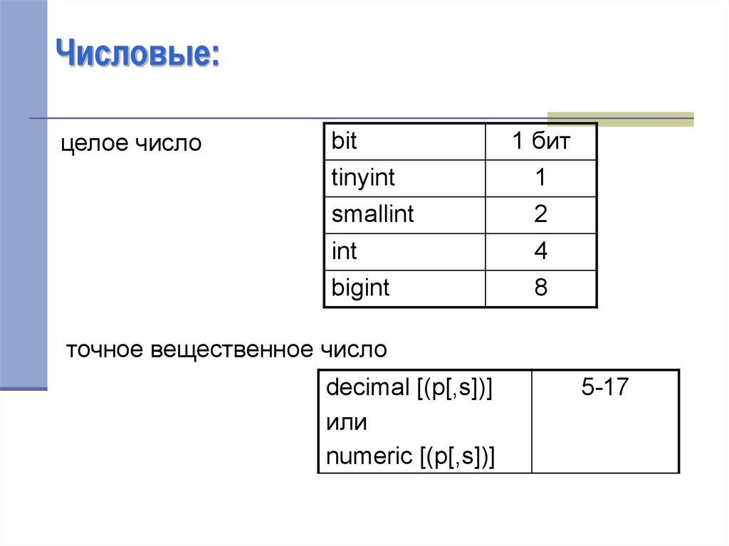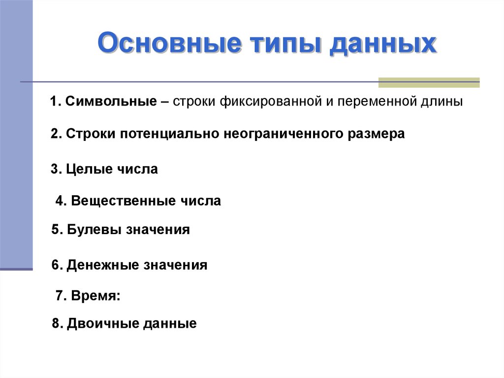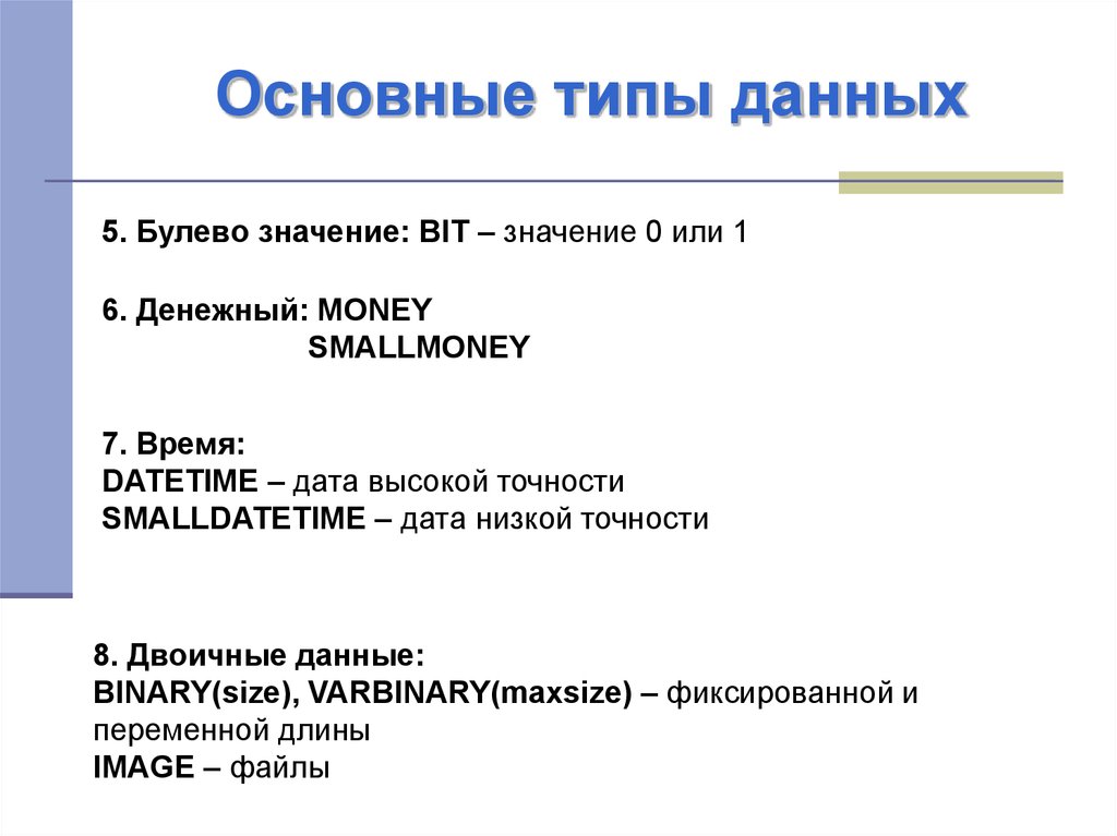 Основные типы данных5. Булево значение: BIT – значение 0 или 1