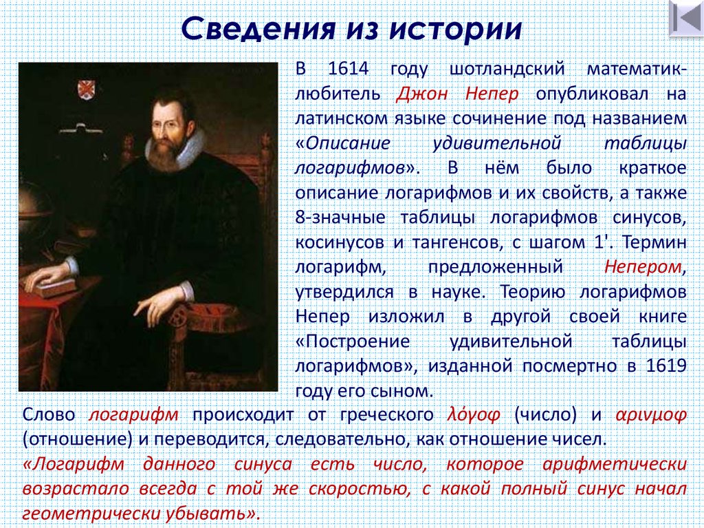 Сведения из историиВ 1614 году шотландский математиклюбитель Джон Непер опубликовал на