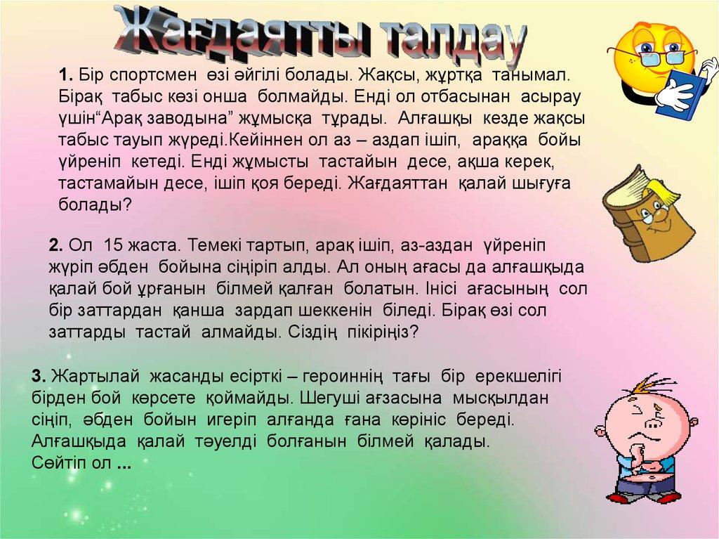 2. Ол 15 жаста. Темекі тартып, арақ ішіп, аз-аздан үйреніп