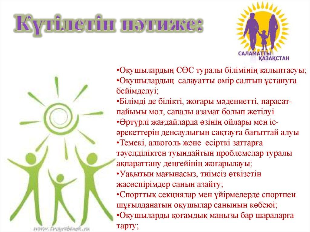 •Оқушылардың СӨС туралы білімінің қалыптасуы;•Оқушылардың салауатты өмір салтын ұстануға