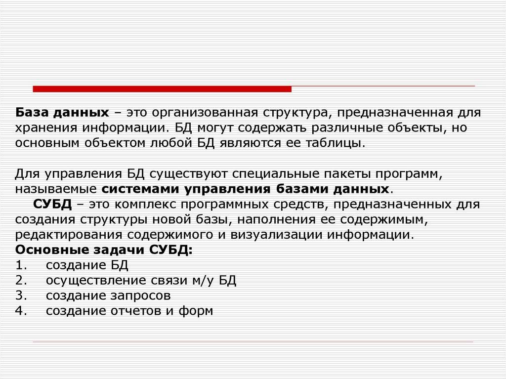 База данных – это организованная структура, предназначенная дляхранения информации. БД могут содержать различные объекты, но