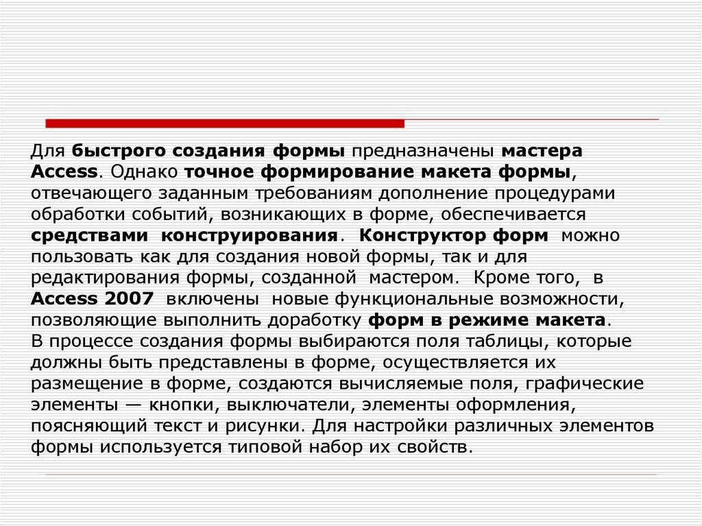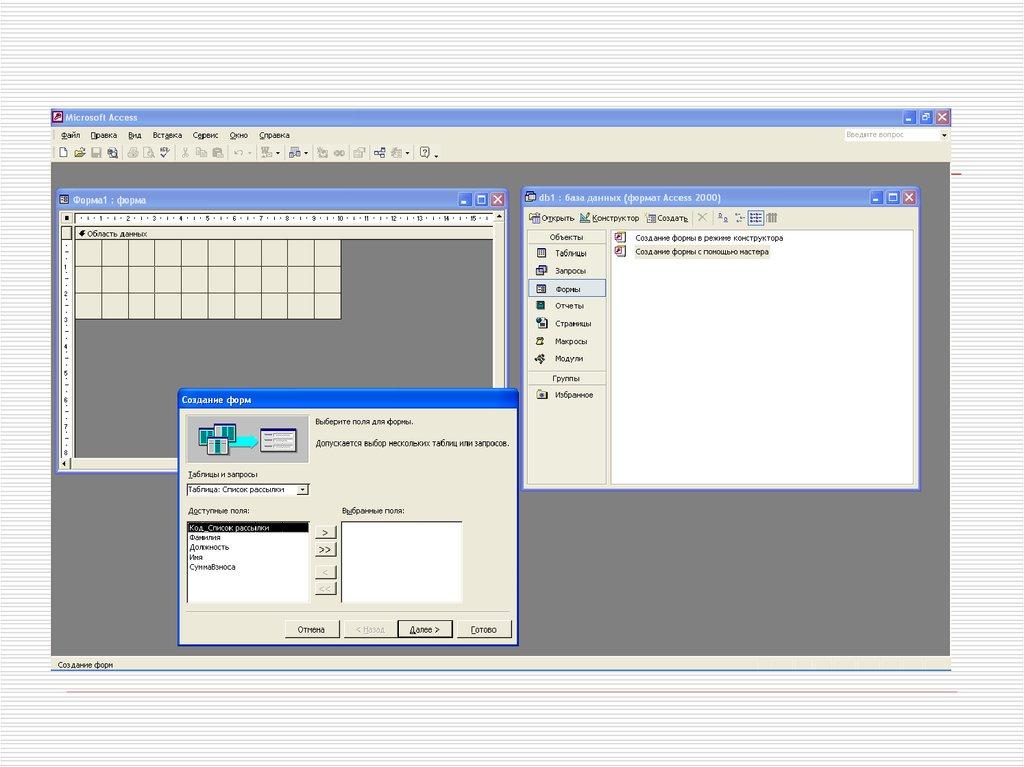 Для быстрого создания формы предназначены мастераAccess. Однако точное формирование макета формы,