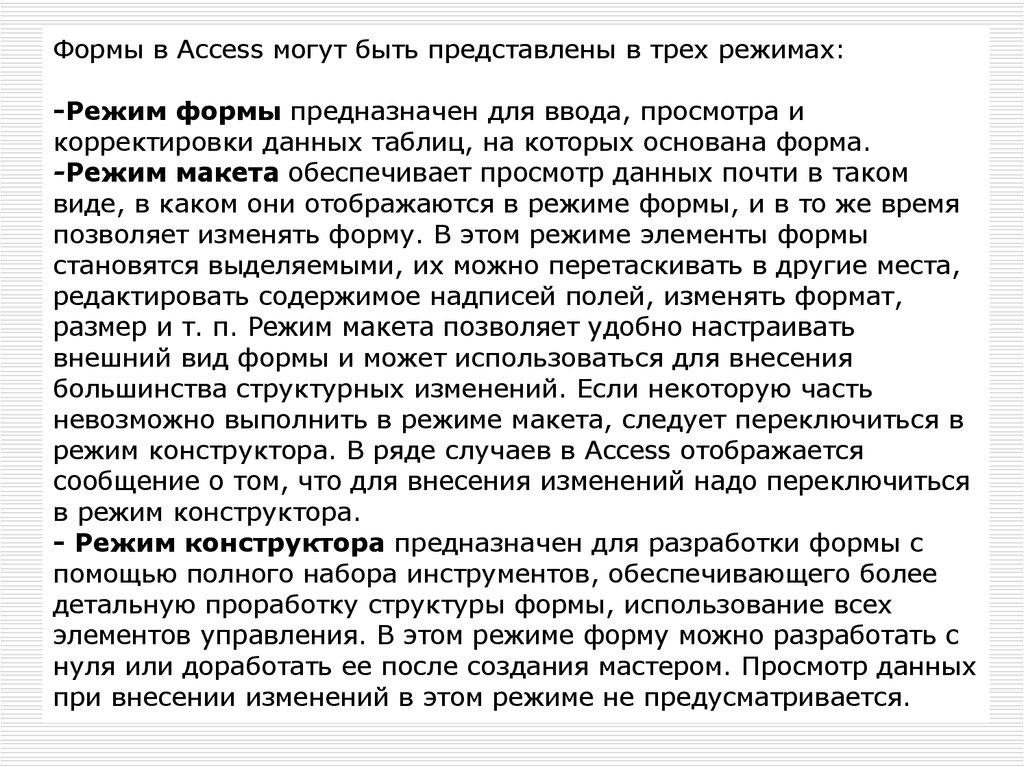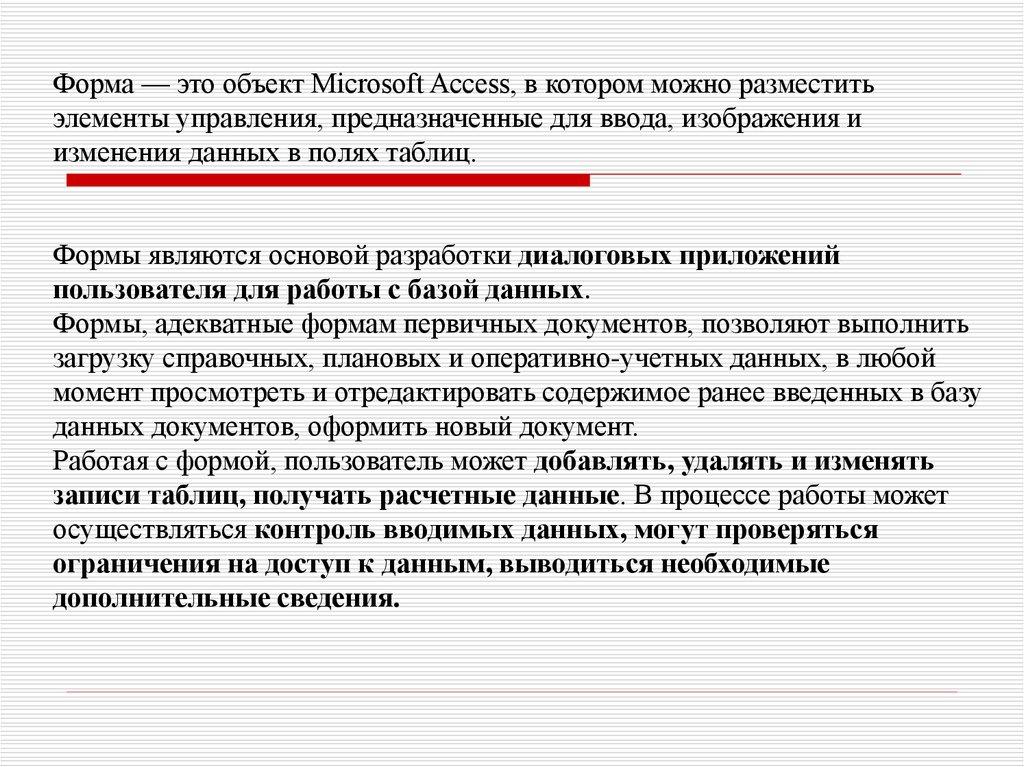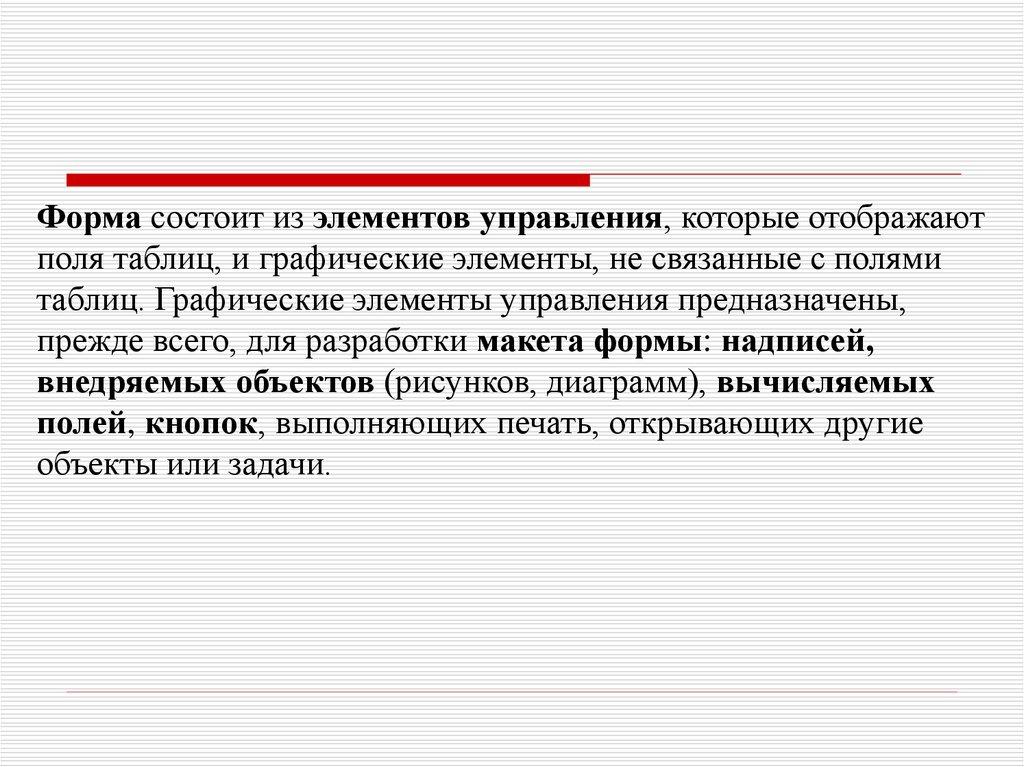 Форма — это объект Microsoft Access, в котором можно разместитьэлементы управления, предназначенные для ввода, изображения и