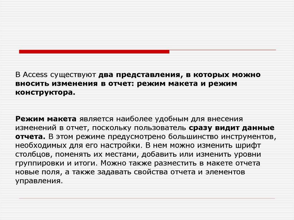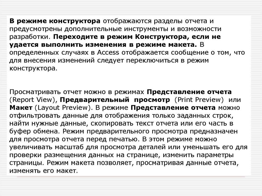 страницы. Режим макета позволяет, просматривая данные отчета,