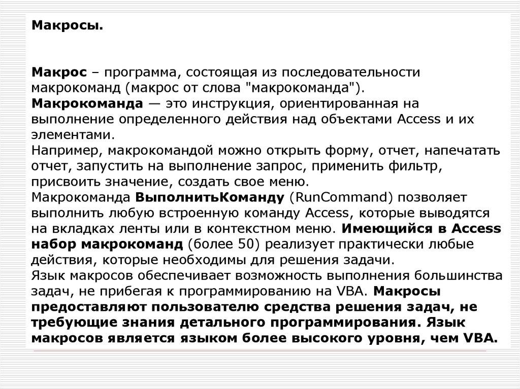 Например, макрокомандой можно открыть форму, отчет, напечатать