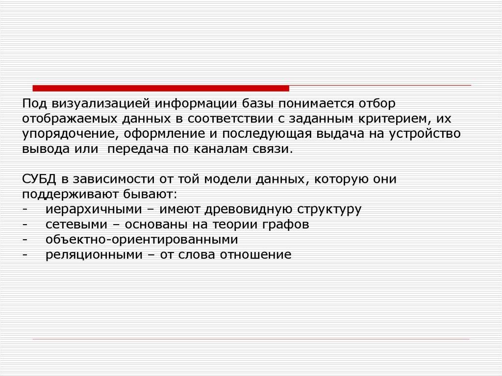 Под визуализацией информации базы понимается отборотображаемых данных в соответствии с заданным критерием, их