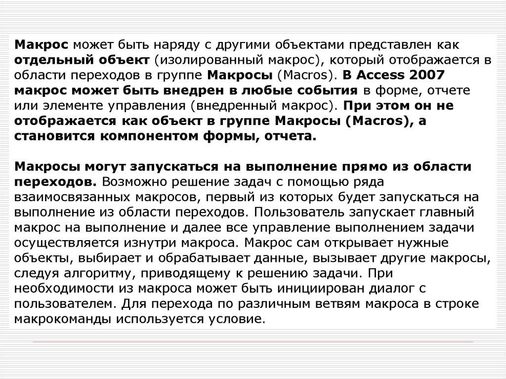 Макрос может быть наряду с другими объектами представлен какотдельный объект (изолированный макрос), который отображается в