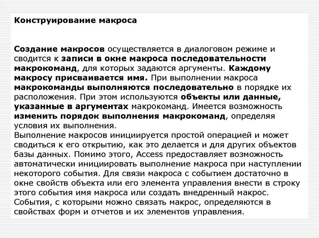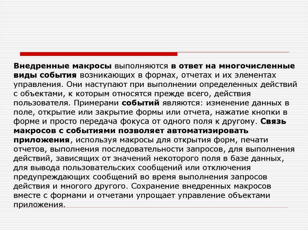 Внедренные макросы выполняются в ответ на многочисленныевиды события возникающих в формах, отчетах и их элементах