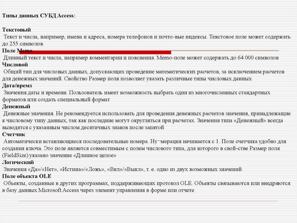 Длинный текст и числа, например комментарии и пояснения. Memo-поле может содержать до 64 000 символов