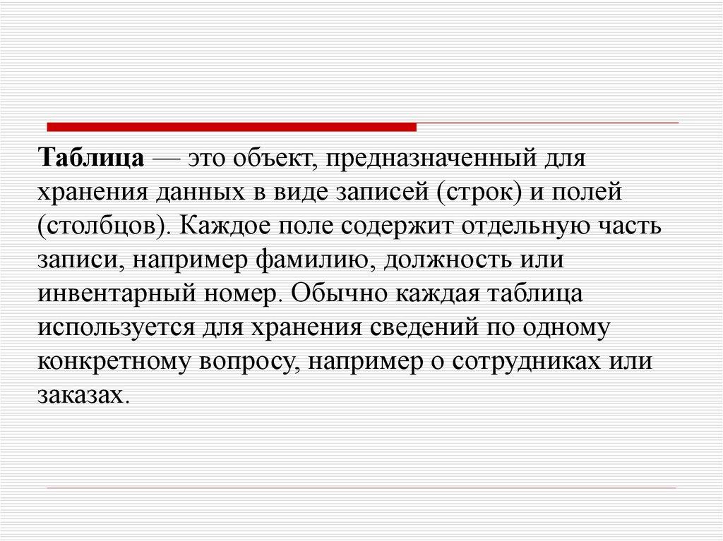 Таблица — это объект, предназначенный дляхранения данных в виде записей (строк) и полей