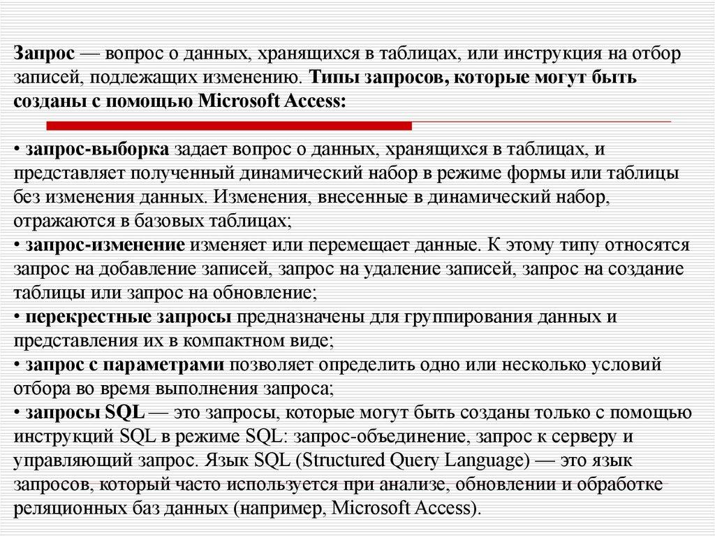 Запрос — вопрос о данных, хранящихся в таблицах, или инструкция на отборзаписей, подлежащих изменению. Типы запросов, которые могут быть