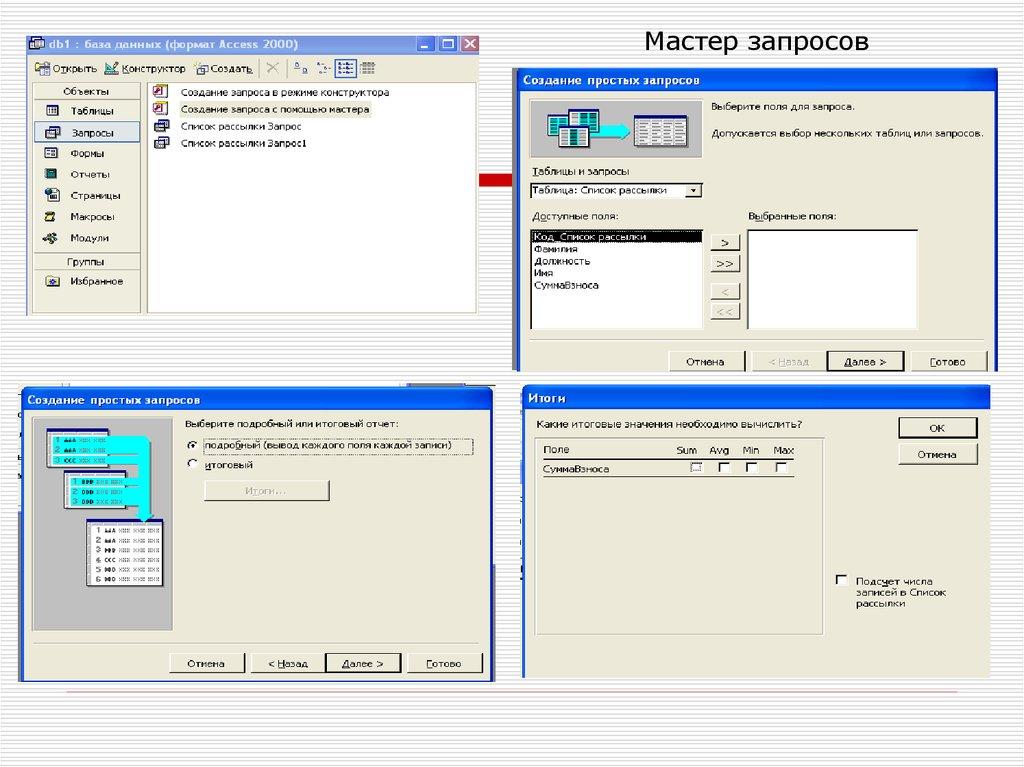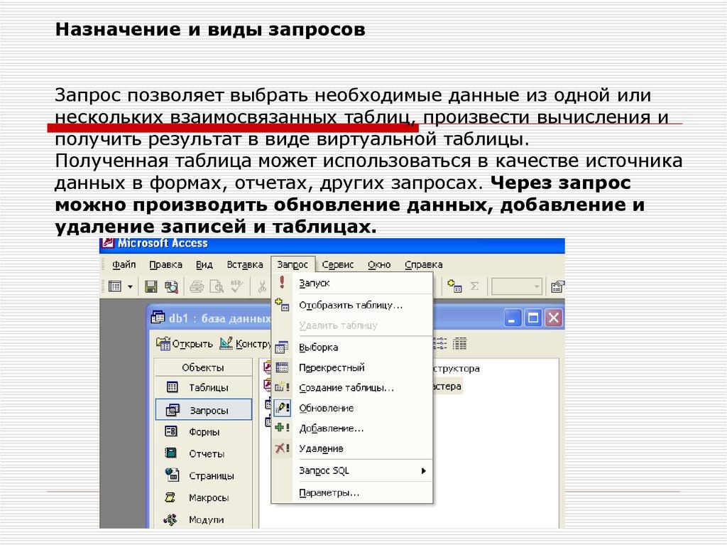 Назначение и виды запросовЗапрос позволяет выбрать необходимые данные из одной или