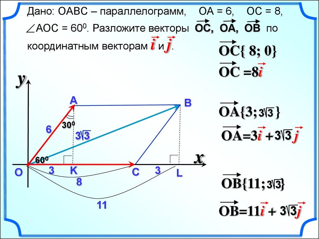 АОС = 600. Разложите векторы ОC, ОA, ОВ по