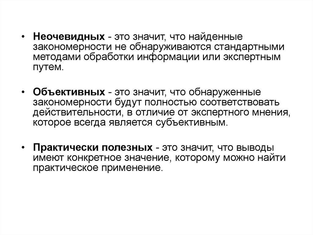 • Неочевидных - это значит, что найденныезакономерности не обнаруживаются стандартными