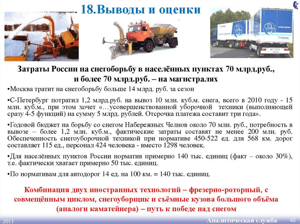 18.Выводы и оценкиЗатраты России на снегоборьбу в населённых пунктах 70 млрд.руб.,