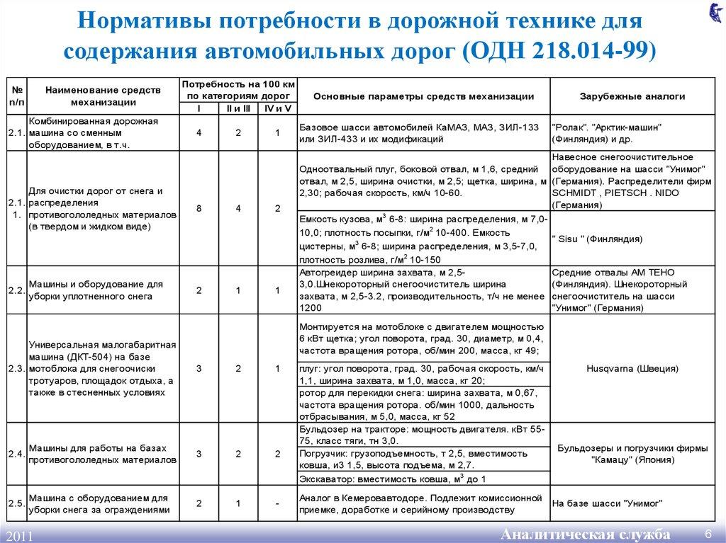 Нормативы потребности в дорожной технике длясодержания автомобильных дорог (ОДН 218.014-99)