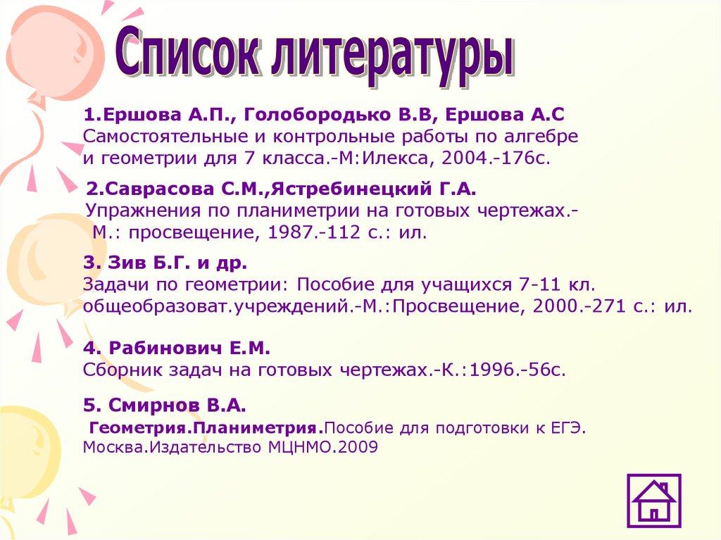 1.Ершова А.П., Голобородько В.В, Ершова А.ССамостоятельные и контрольные работы по алгебре