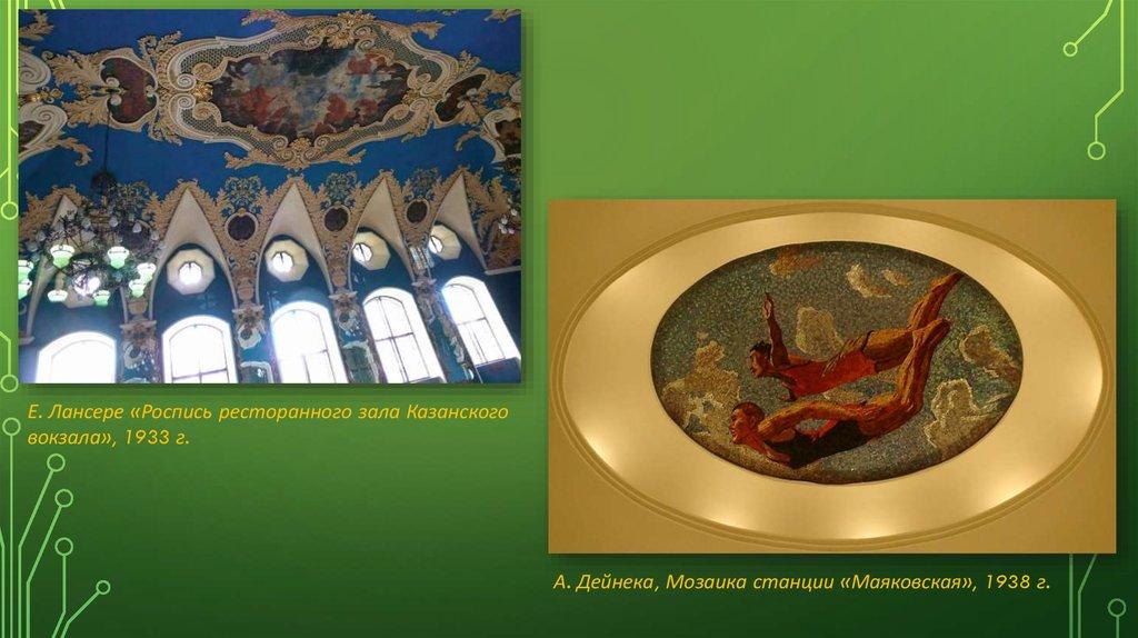 Дейнека также в это время вносит большой вклад в монументальную живопись. Его мозаики станции