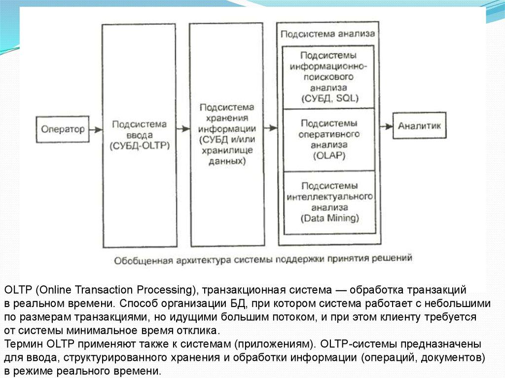 OLTP (Online Transaction Processing), транзакционная система — обработка транзакцийв реальном времени. Способ организации БД, при котором система работает с небольшими